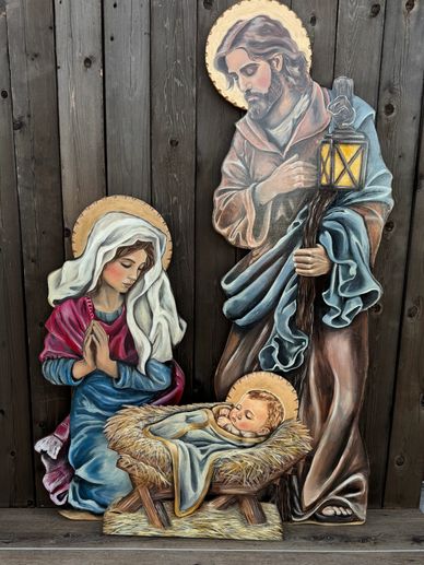 This 3 piece set captures the quiet beauty of the Holy Family on the night of Christ's birth. Mary kneels in prayerful devotion, Joseph stands watch with lantern in hand, and baby Jesus rests peacefully in the manger- the heart of the Christmas story. Joseph stands 5 foot tall.