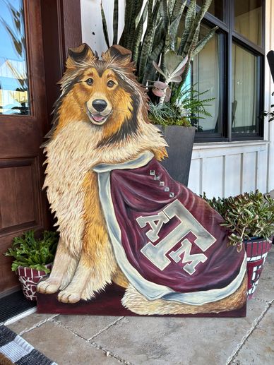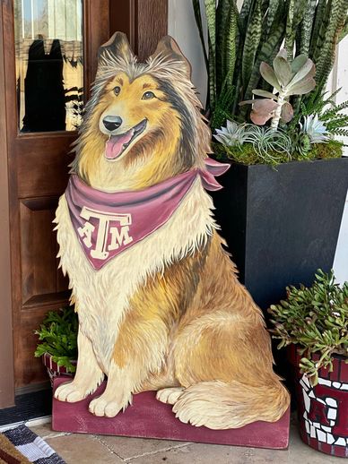 Celebrate Aggie tradition with this handcrafted, hand-painted Reveille featuring her iconic maroon blanket. Measuring 39” tall and 31” wide, this statement piece is perfect for game day or year round display.